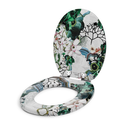 Entstanden aus der Zusammenarbeit zwischen der Maison Christian Lacroix und TohaaDesign, vereint der WC-Sitz "Algae Bloom" auf harmonische Weise kostbare Mineralien und Meeresflora. So entsteht eine neue Welt, in der Malachit schimmernde Moiré-Reflexe aufweist und Algen die feinen Muster der zartesten Spitzen nachahmen, um Ihrem Badezimmer einen Hauch von Eleganz und Raffinesse zu verleihen.
