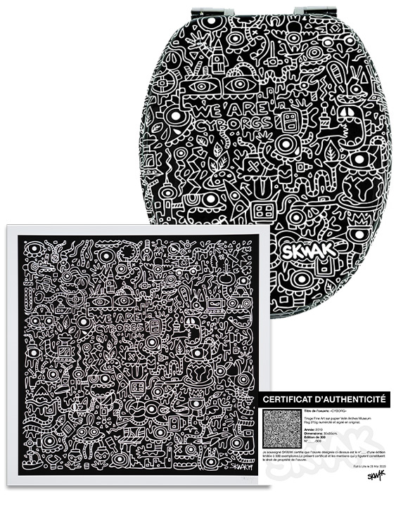 Exhibited around the world, from Paris to Los Angeles to Shanghai, his drawing is automatic, revisiting everyday life to the point of absurdity. This is certainly the strength and the unique DNA of his signature that very quickly came to seek out houses like Microsoft,Legallais and... TohaaDesign. Available in black and white, the "Cyborg" model, reproduction of the original work "Maniac Cyborg".