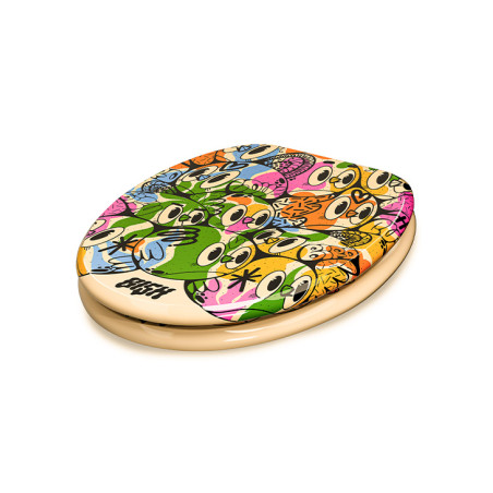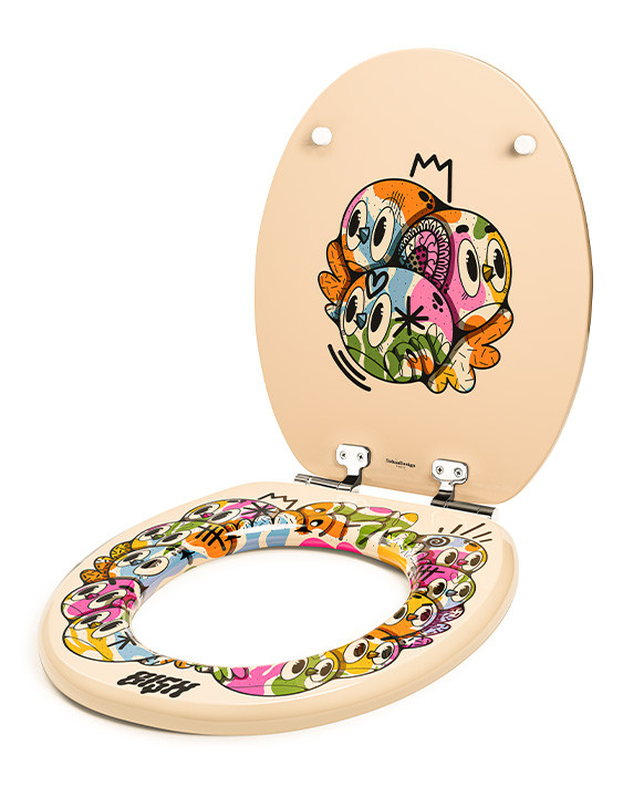 El asiento WC Color Bomb, segundo modelo exclusivo firmado por el artista Bishop Parigo para TohaaDesign, destaca por su explosión de color, con un fondo pastel delicado y aves llamativas llenas de energía. El contraste entre los tonos suaves y los toques vibrantes crea un diseño gráfico potente y fácilmente reconocible. Un asiento de inodoro original que aporta un toque artístico e inesperado al espacio de baño.