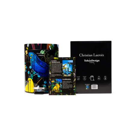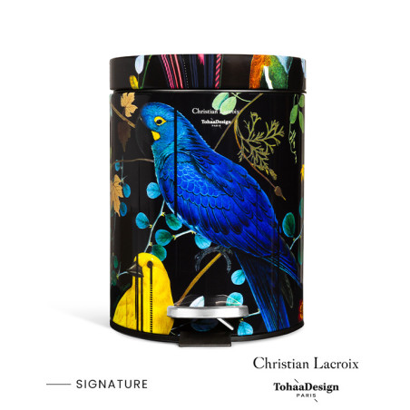 La Maison Christian Lacroix s’associe à la marque TohaaDesign pour vous proposer un modèle de poubelle de salle de bain unique. Ce dessin emblématique de la prestigieuse Maison Lacroix "Birds Sinfonia", au fond noir intense, s’anime d’une nuée d’oiseaux aux plumages chatoyants retraçant les portées musicales de leur propre chant.